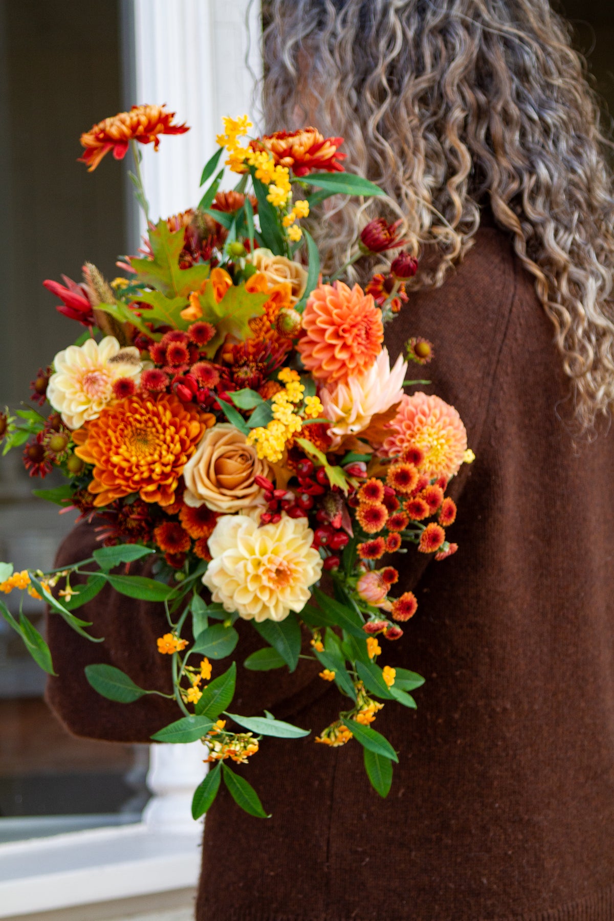 This arrangement burns with rich, glowing reds and deep oranges — a palette drawn from firelight and fading sunsets. Featuring beautiful Norfolk-grown chrysanthemums, complemented by toffee-toned roses, textured foliage, and seasonal grasses, each stem has been carefully chosen to evoke the warmth and richness of November evenings.