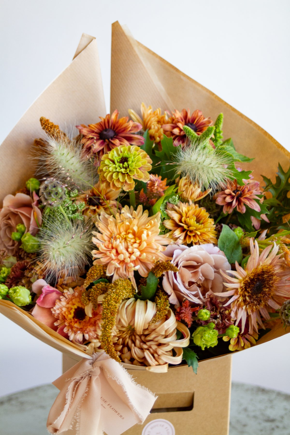 This arrangement captures the palette of falling leaves: earthy greens, warm creams, soft caramels, and deep russet tones. Gathered from the fields of Ellie’s Norfolk Flower Farm, it features the very last of the dahlias, show-stopping chrysanthemums, toffee-toned roses, airy grasses, and scented foliage — each stem chosen to echo the richness and texture of autumn.
